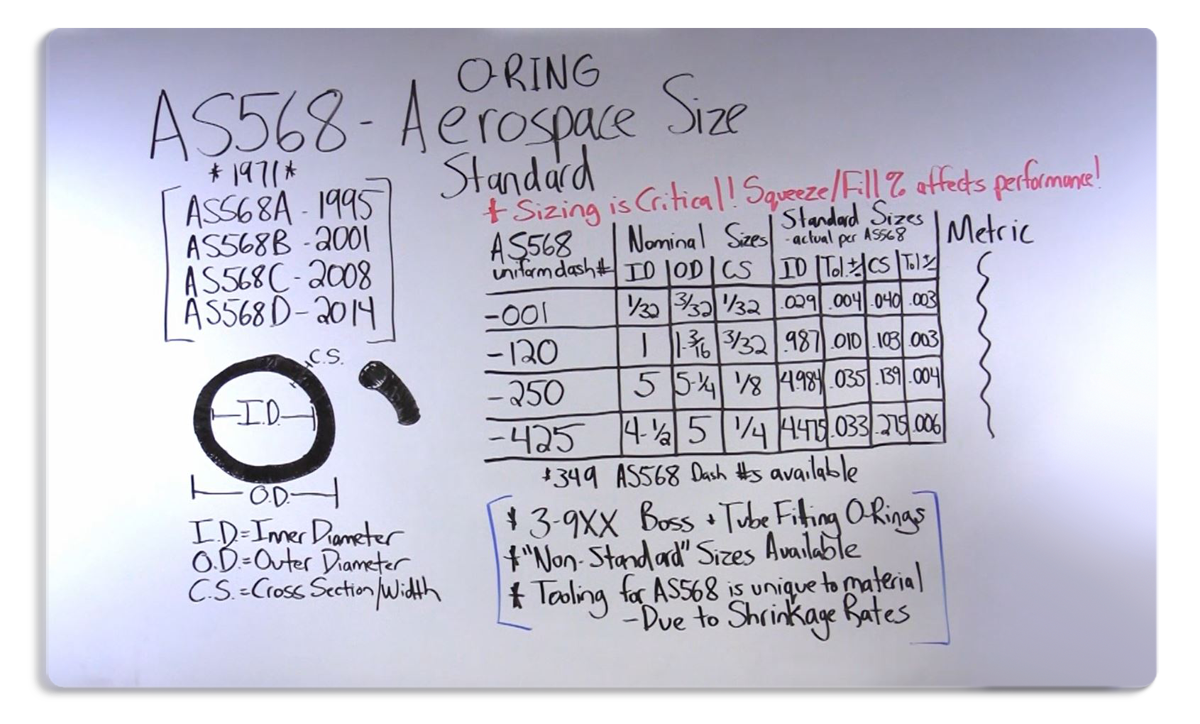 Today we’re going to talk o rings. We get frequent calls, request for quotes, emails, regarding o ring and o ring sizing. Today we are going to run through and explain how o rings are sized and talk a little bit about the language of o ring sizing. o rings are sized using AS568; which is an aerospace standard that was published back in the seventies. The original AS568 was published in 1971, since then there have been several versions A through D – you can see the years that they were published – 1995, 2001, 2008, and 2014 is the latest.