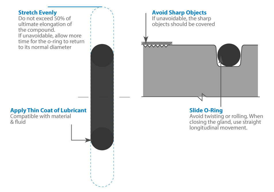 - Stretch the O-ring Evenly - Rule of thumb is to not exceed 50% of the ultimate elongation of the o-ring compound. If it needs to exceed, allow more time for the o-ring to return to its normal diameter.